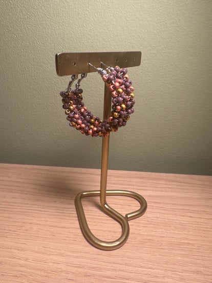 Kleurrijke oorbel in zilver-stainlesssteal met roze-goud-paarse kralen.