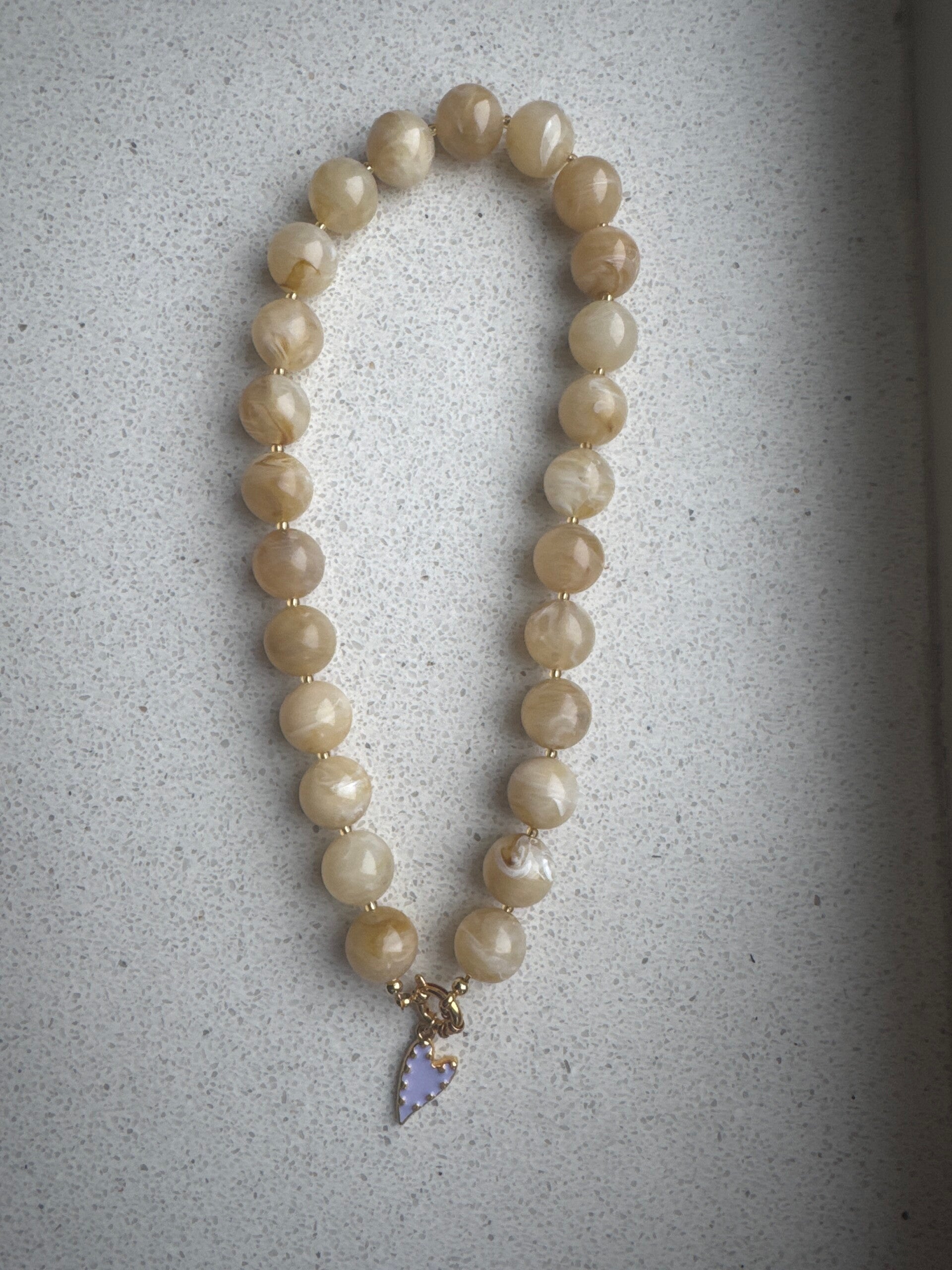 Middelgrote kralenketting in gemeleerd beige, voorzien van lilakleurig hart-bedel. Beslag in goudkleurig stainless steal.