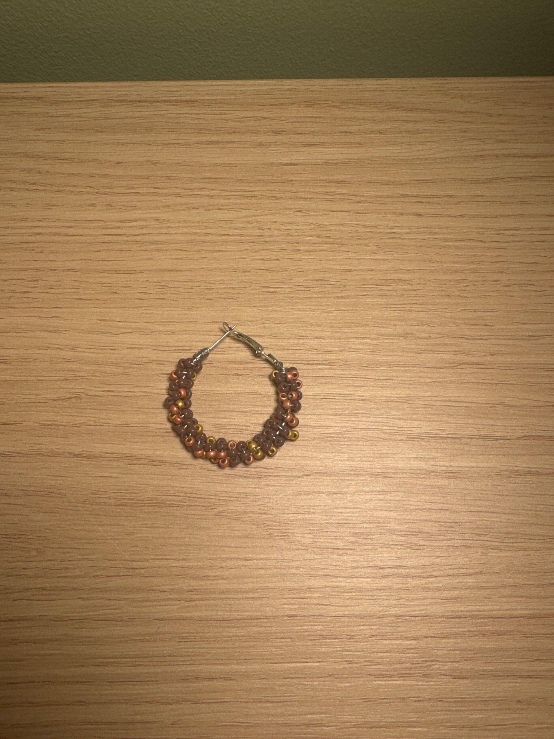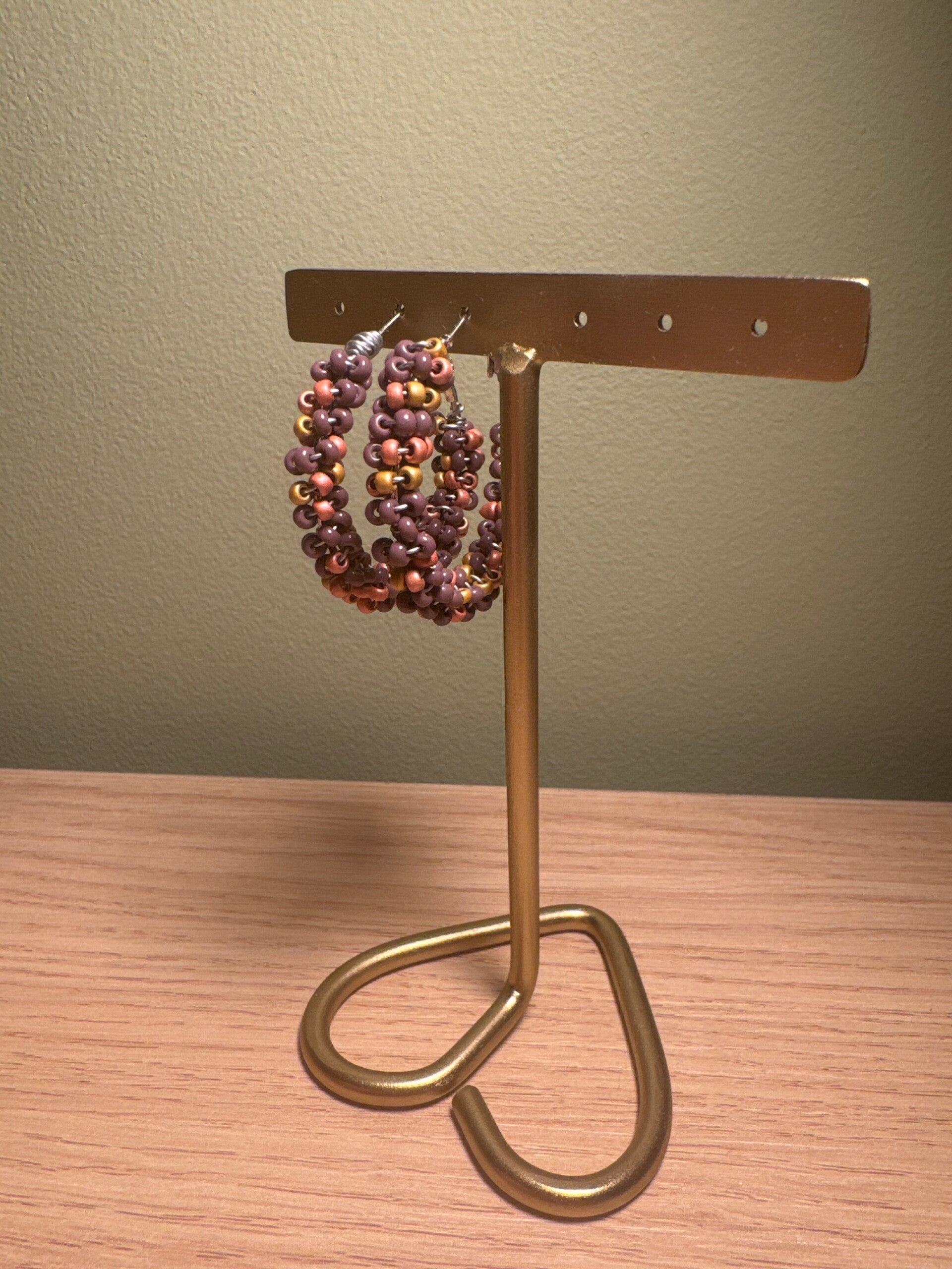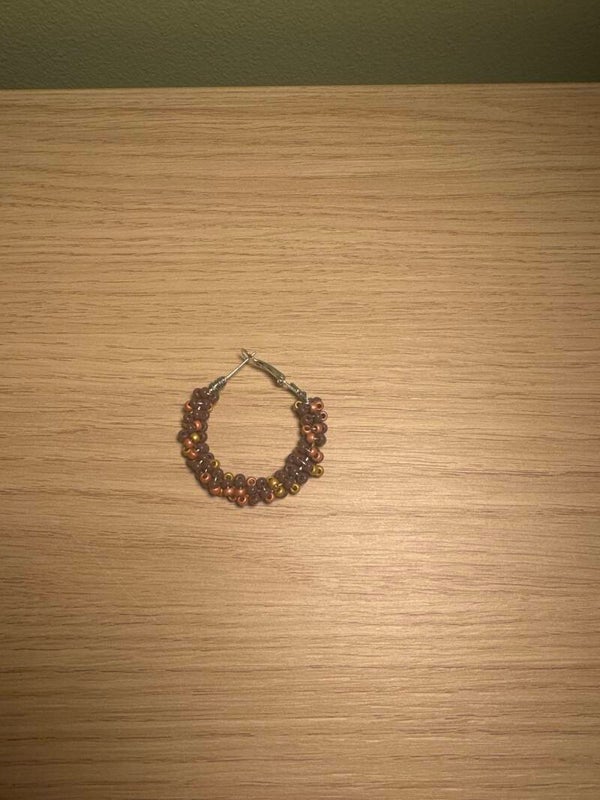 Kleurrijke oorbel in zilver-stainlesssteal met roze-goud-paarse kralen.