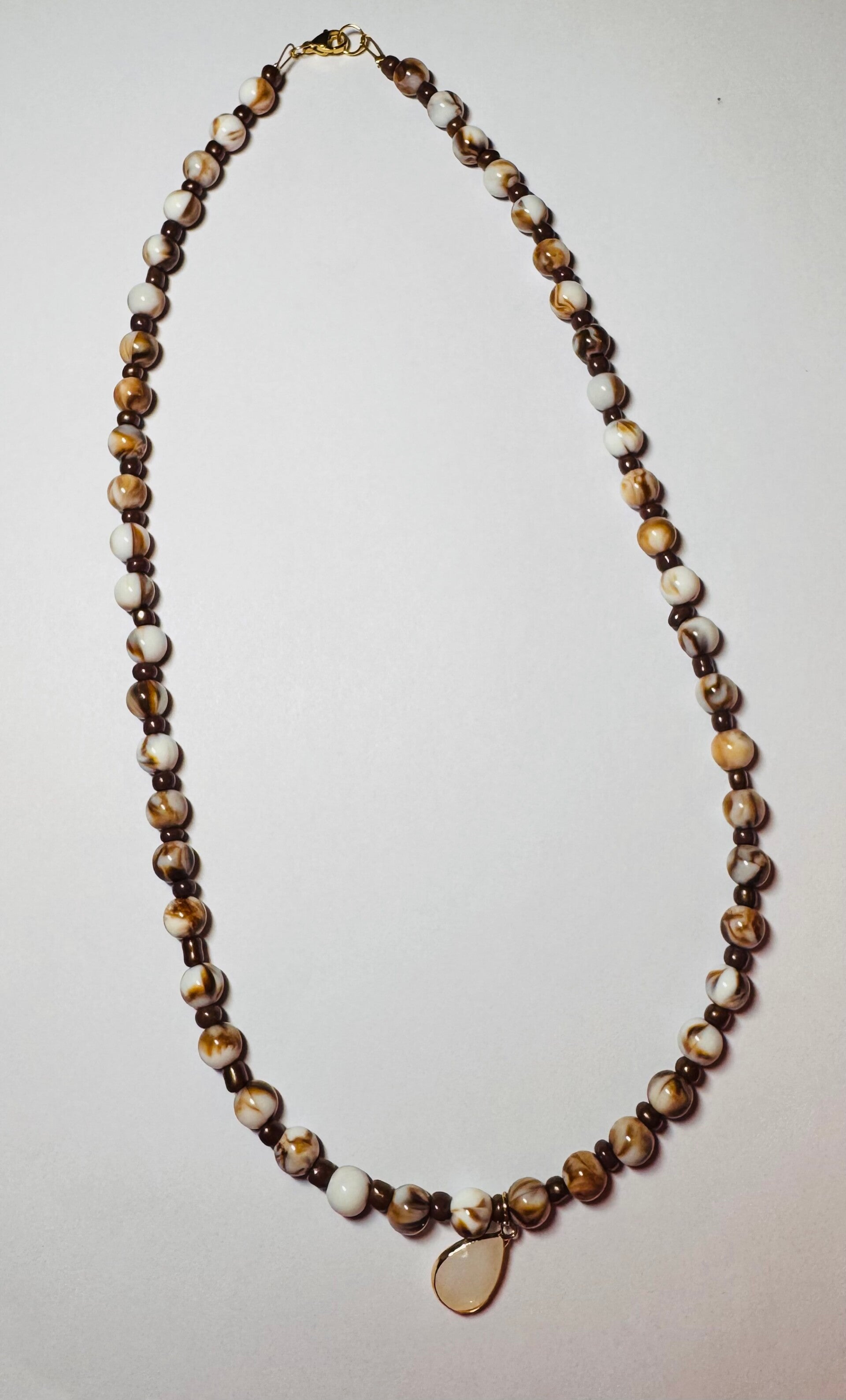 Ketting met marble wit/bruine kralen en een creme kleurige druppel hanger. Beslag in goudkleurig stainless steel. Langer model.